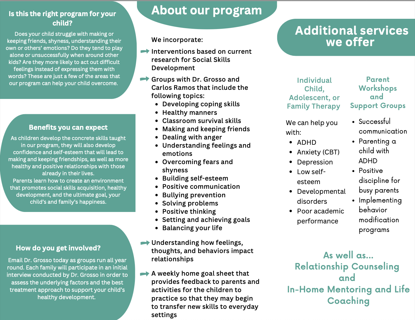 Many of the children I work with come in to address socialization issues, either through 1:1 therapy or through my Social Skills Group for Kids. My groups are targeted to improve socialization skills and/or teach coping skills to handle conflicts and other difficulties. I offer 2 groups, one for elementary aged kids and the other for middle schoolers. I specialize in diagnostic evaluations and treatment for pediatric populations.